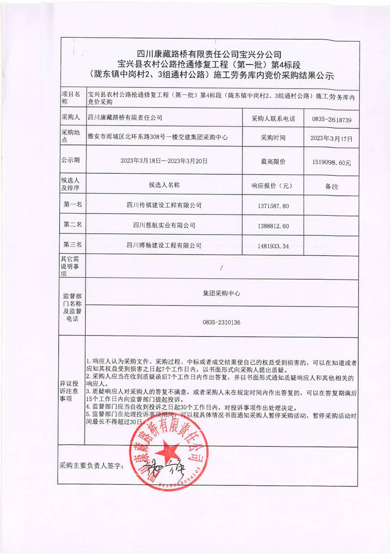 四川康藏路橋有限責(zé)任公司寶興分公司寶興縣農(nóng)村公路搶通修復(fù)工程(第一批)第4標(biāo)段(隴東鎮(zhèn)中崗村2、3組通村公路)施工勞務(wù)庫內(nèi)競價(jià)采購結(jié)果公示