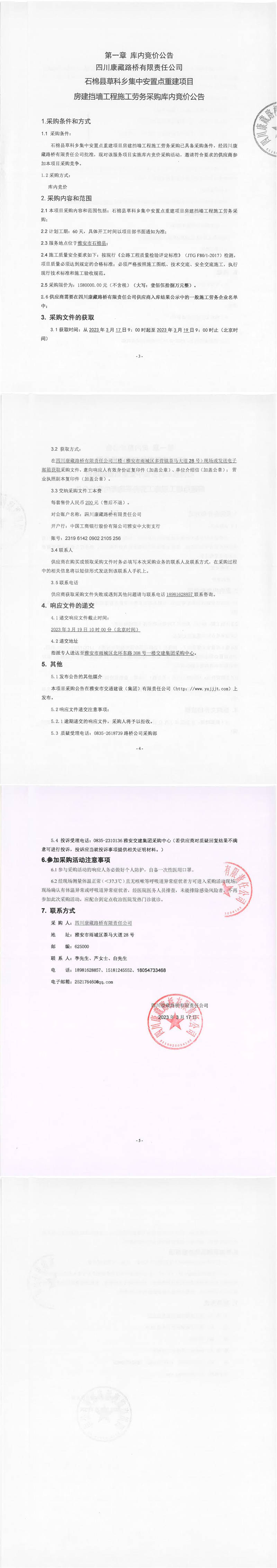 四川康藏路橋有限責(zé)任公司石棉草科鄉(xiāng)集中安置點(diǎn)重建項目房建擋墻工程施工勞務(wù)采購庫內(nèi)競價公告