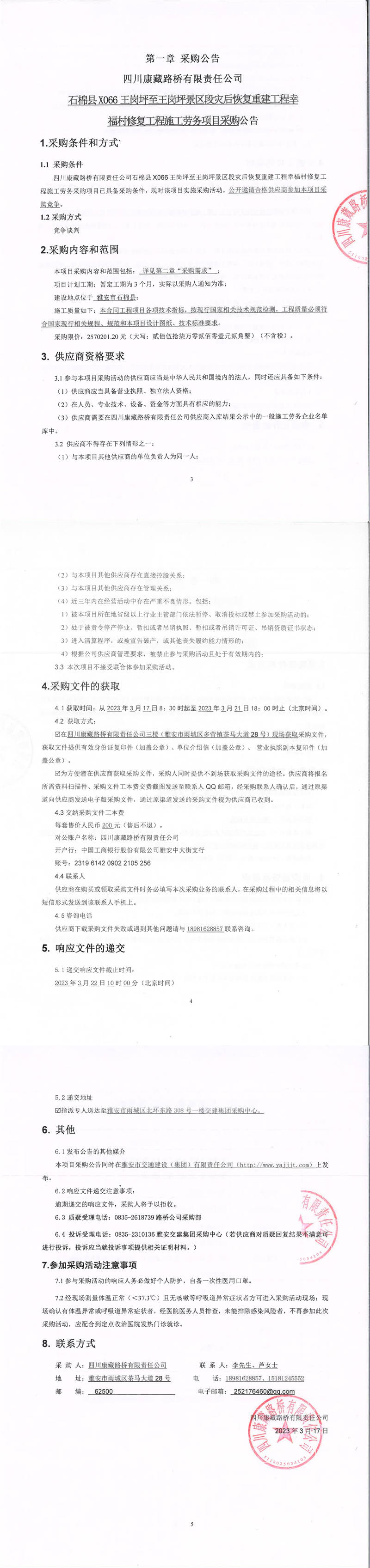 四川康藏路橋有限責(zé)任公司石棉縣X066王崗坪至王崗坪景區(qū)段災(zāi)后恢復(fù)重建工程幸福村修復(fù)工程施工勞務(wù)項目采購公告