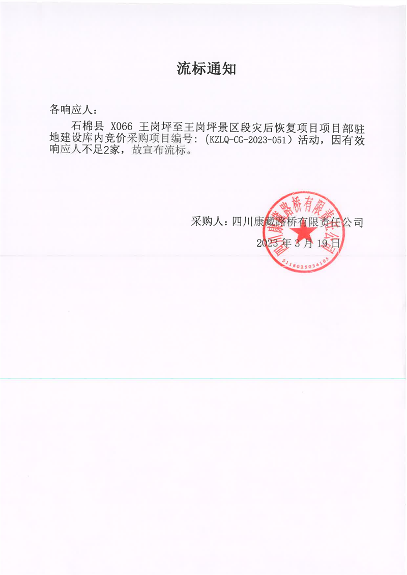 四川康藏路橋有限責(zé)任公司石棉縣X066王崗坪至王崗坪景區(qū)段災(zāi)后恢復(fù)項(xiàng)目項(xiàng)目部駐地建設(shè)庫內(nèi)競(jìng)價(jià)采購流標(biāo)通知
