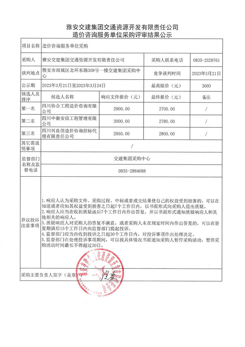 雅安交建集團(tuán)交通資源開(kāi)發(fā)有限責(zé)任公司造價(jià)咨詢(xún)服務(wù)單位采購(gòu)評(píng)審結(jié)果公示
