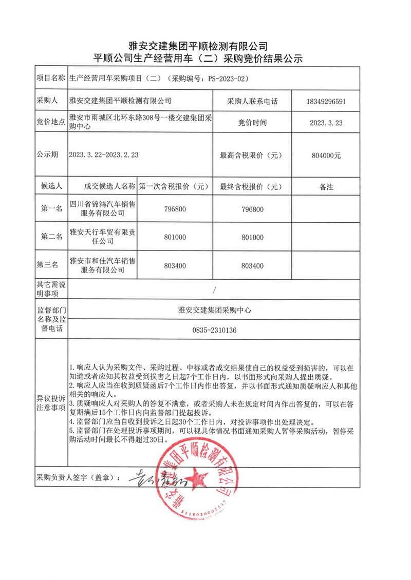 雅安交建集團(tuán)平順檢測(cè)有限公司平順公司生產(chǎn)經(jīng)營(yíng)用車(chē)(二)采購(gòu)競(jìng)價(jià)結(jié)果公示