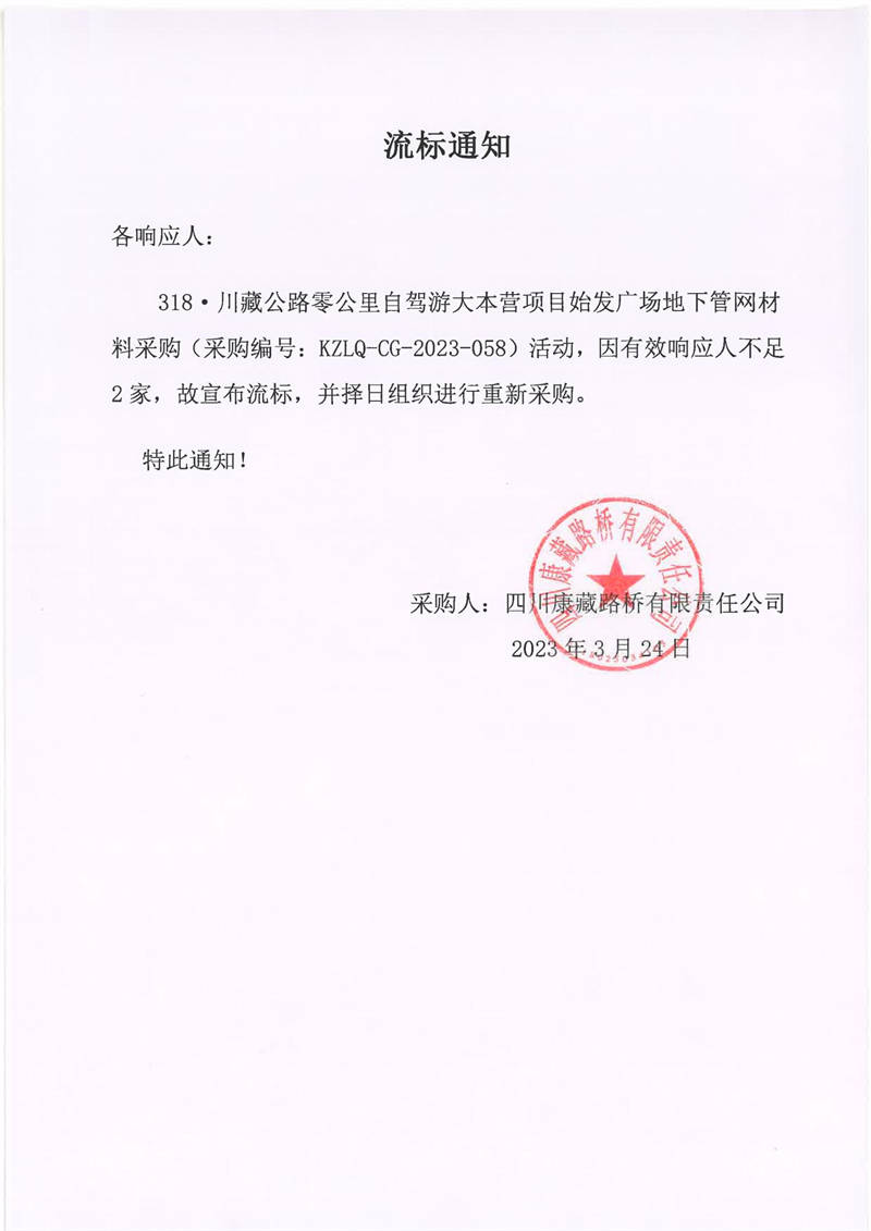 四川康藏路橋有限責(zé)任公司318·川藏公路零公里自駕游大本營(yíng)項(xiàng)目始發(fā)廣場(chǎng)地下管網(wǎng)材料采購(gòu)流標(biāo)通知