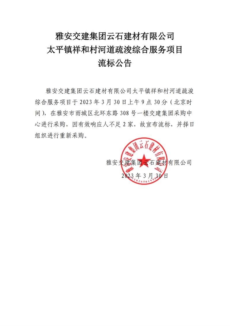 雅安交建集團云石建材有限公司太平鎮(zhèn)祥和村河道疏浚綜合服務(wù)項目流標(biāo)通知