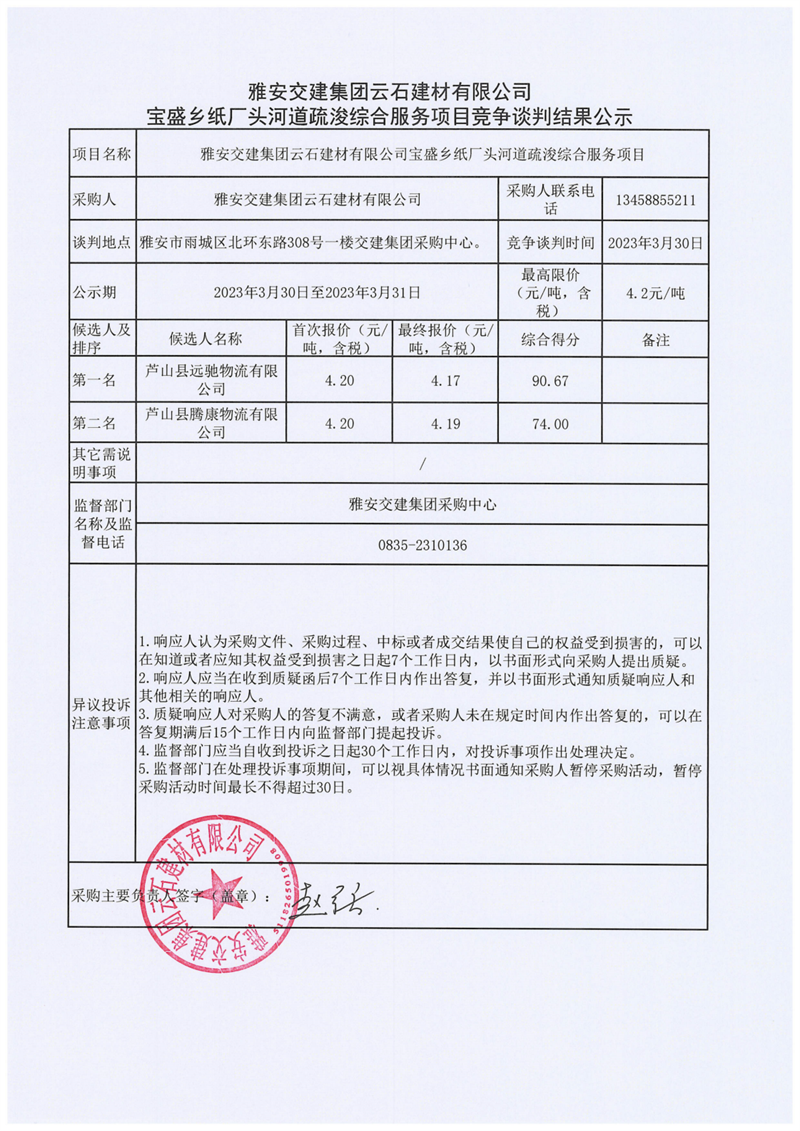 雅安交建集團(tuán)云石建材有限公司寶盛鄉(xiāng)紙廠頭河道疏浚綜合服務(wù)項目競爭談判結(jié)果公示