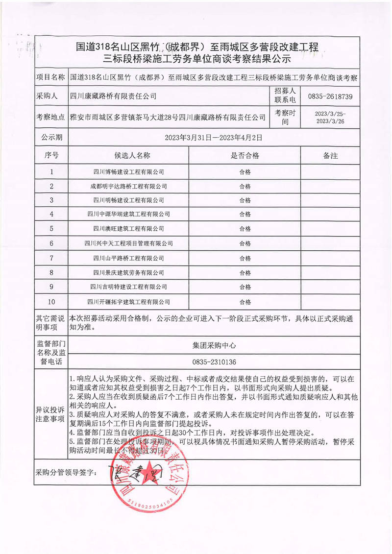四川康藏路橋有限責任公司國道318名山區(qū)黑竹(成都界)至雨城區(qū)多營段改建工程三標段橋梁施工勞務單位商談考察結果公示