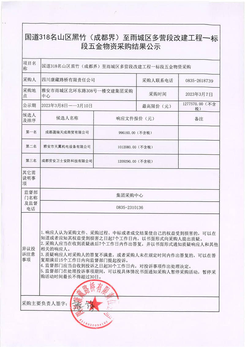 四川康藏路橋有限責(zé)任公司國(guó)道318名山區(qū)黑竹(成都界)至雨城區(qū)多營(yíng)段改建工程一標(biāo)段五金物資采購(gòu)結(jié)果公示