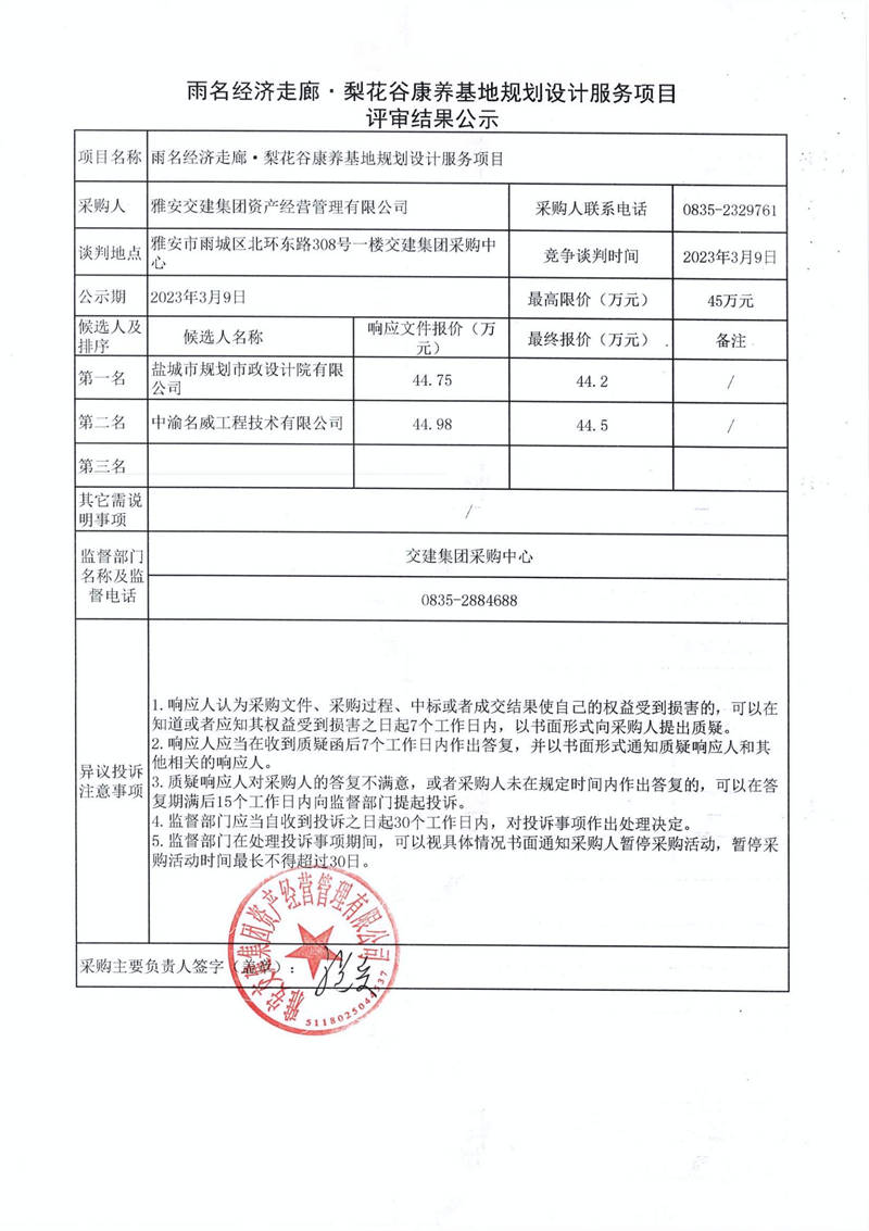 雅安交建集團(tuán)資產(chǎn)經(jīng)營(yíng)管理有限公司雨名經(jīng)濟(jì)走廊·梨花谷康養(yǎng)基地規(guī)劃設(shè)計(jì)服務(wù)項(xiàng)目采購(gòu)結(jié)果公示