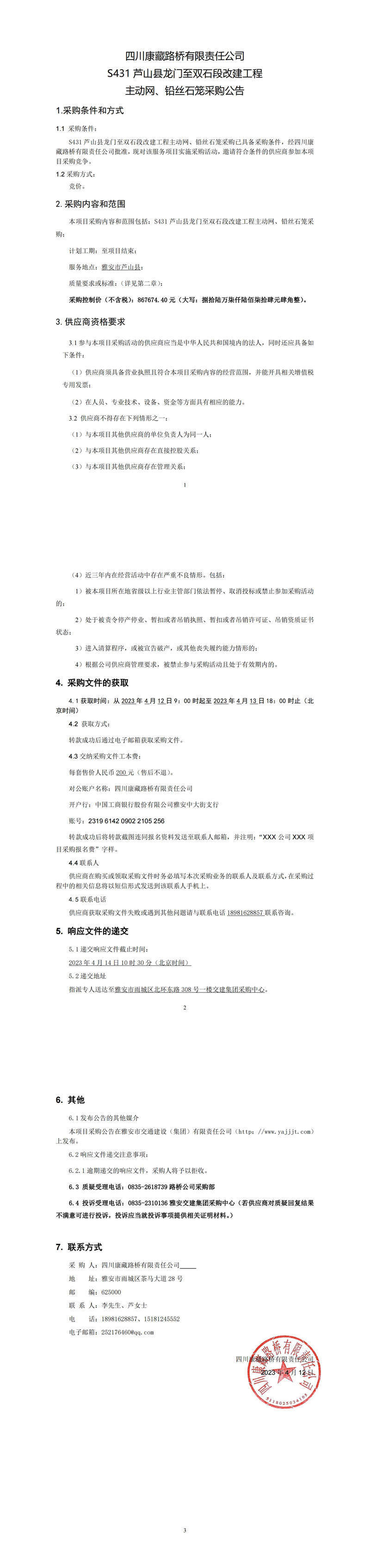四川康藏路橋有限責(zé)任公司S431蘆山縣龍門至雙石段改建工程主動(dòng)網(wǎng)、鉛絲籠采購(gòu)公告