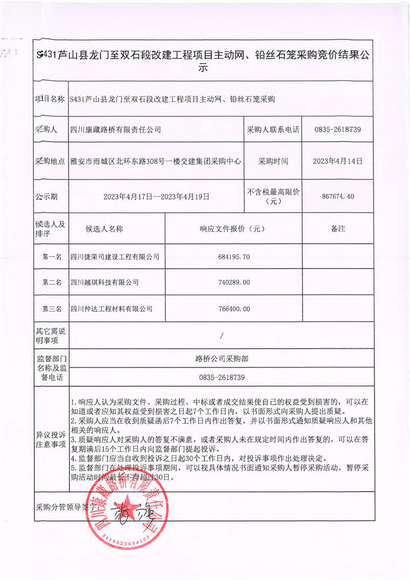 四川康藏路橋有限責任公司S431蘆山縣龍門至雙石段改建工程項目主動網(wǎng)、鉛絲石籠采購競價結(jié)果公示