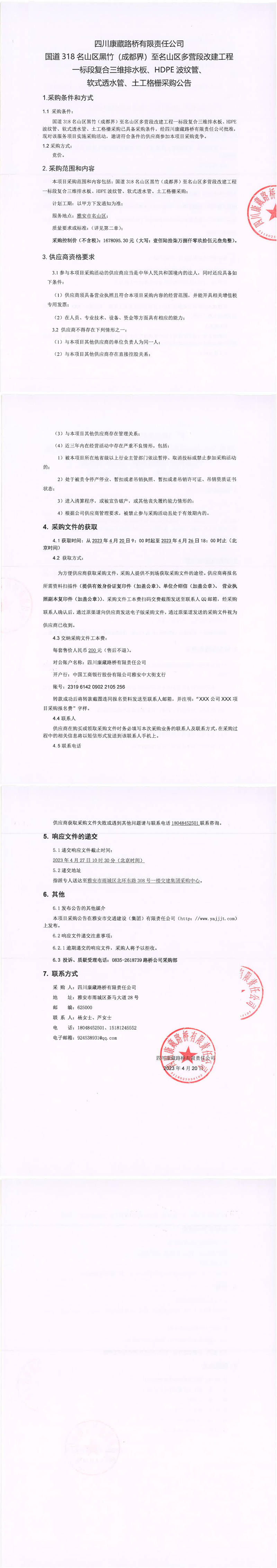 四川康藏路橋有限責(zé)任公司國道318名山區(qū)黑竹(成都界)至雨城區(qū)多營段改建工程一標(biāo)段復(fù)合三維排水板、HDPE波紋管、軟式透水管、土工格柵采購公告