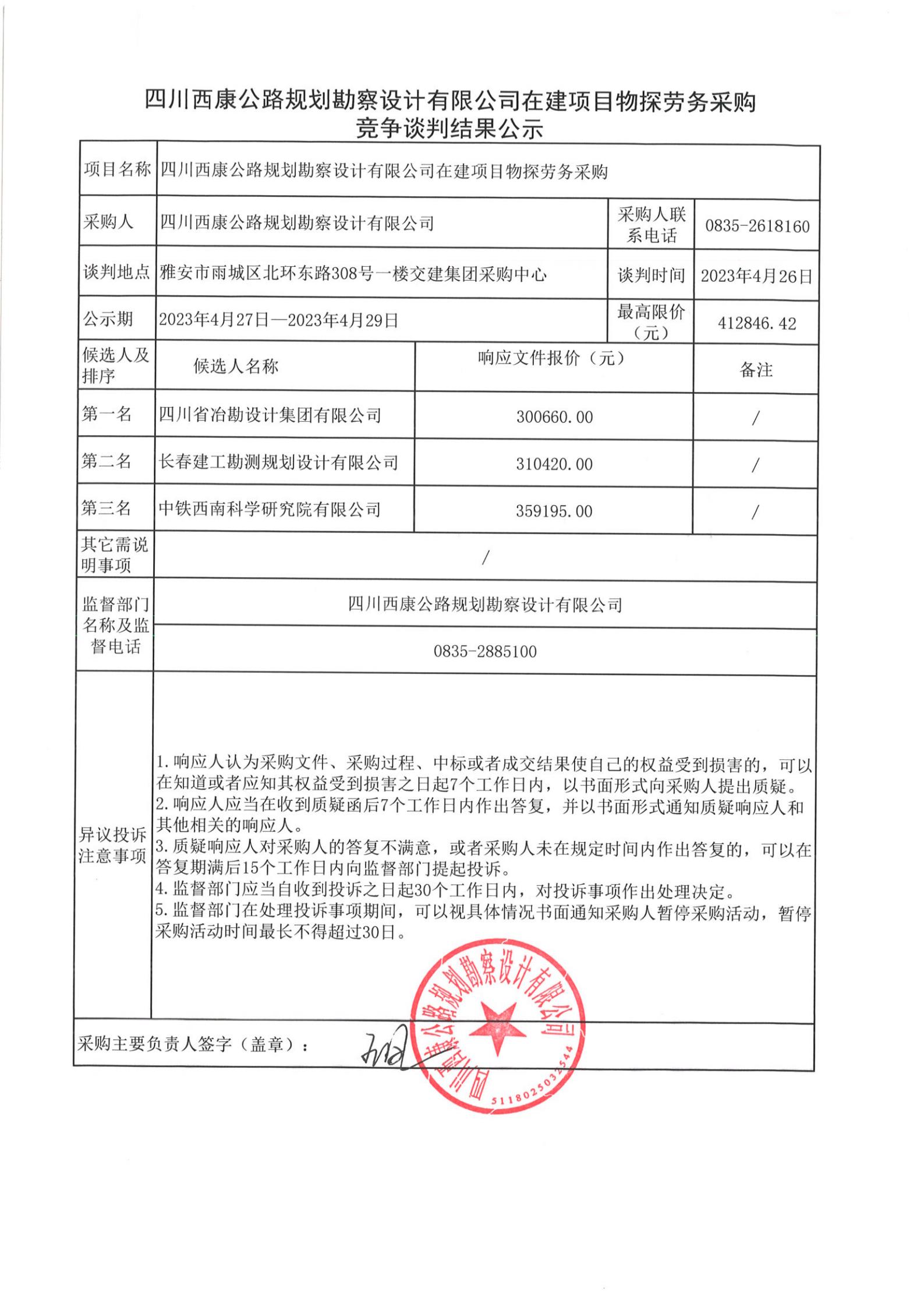 四川西康公路規(guī)劃勘察設(shè)計(jì)有限公司在建項(xiàng)目物探勞務(wù)采購競(jìng)爭談判結(jié)果公示