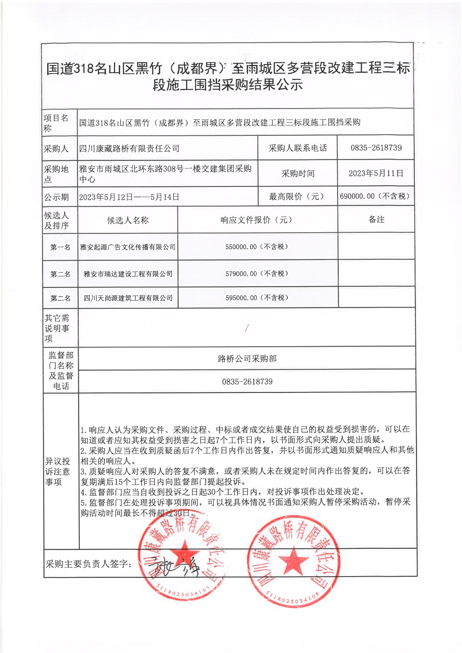 四川康藏路橋有限責(zé)任公司國(guó)道318名山區(qū)黑竹(成都界)至雨城區(qū)多營(yíng)段改建工程三標(biāo)段施工圍擋采購(gòu)結(jié)果公示