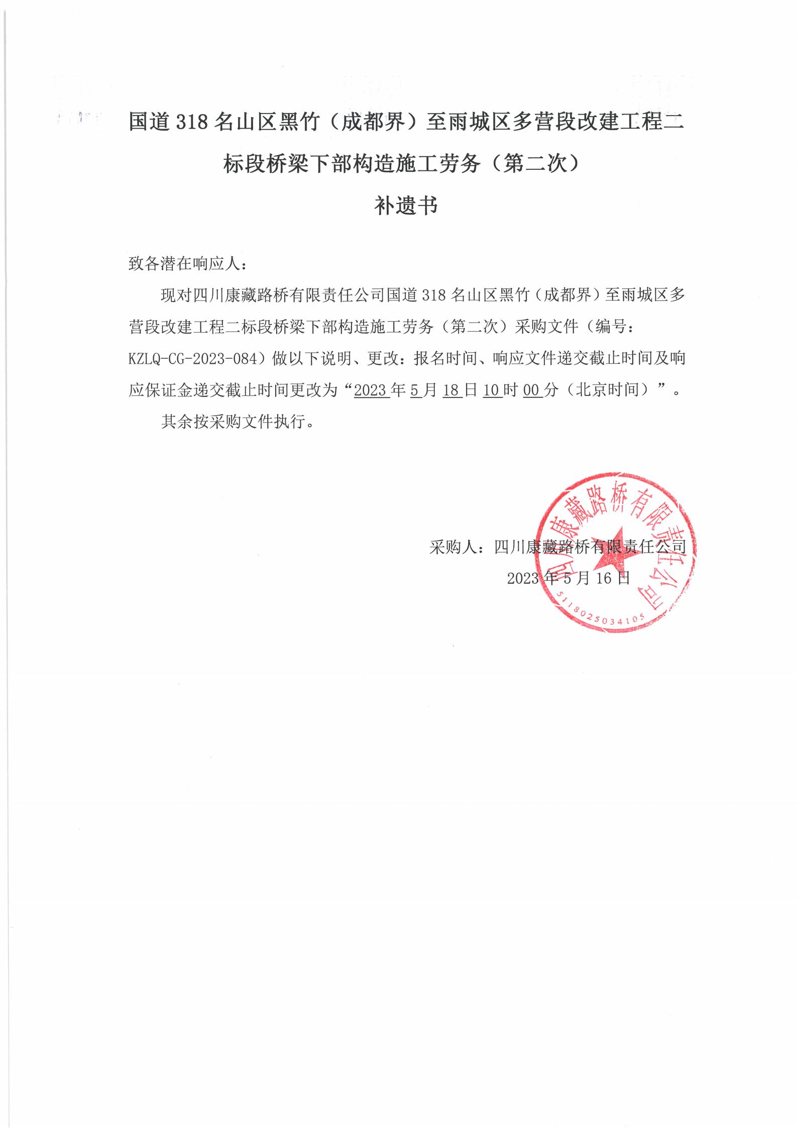 四川康藏路橋有限責(zé)任公司國(guó)道318名山區(qū)黑竹(成都界)至雨城區(qū)多營(yíng)段改建工程二標(biāo)段橋梁下部構(gòu)造施工勞務(wù)(第二次)補(bǔ)遺書