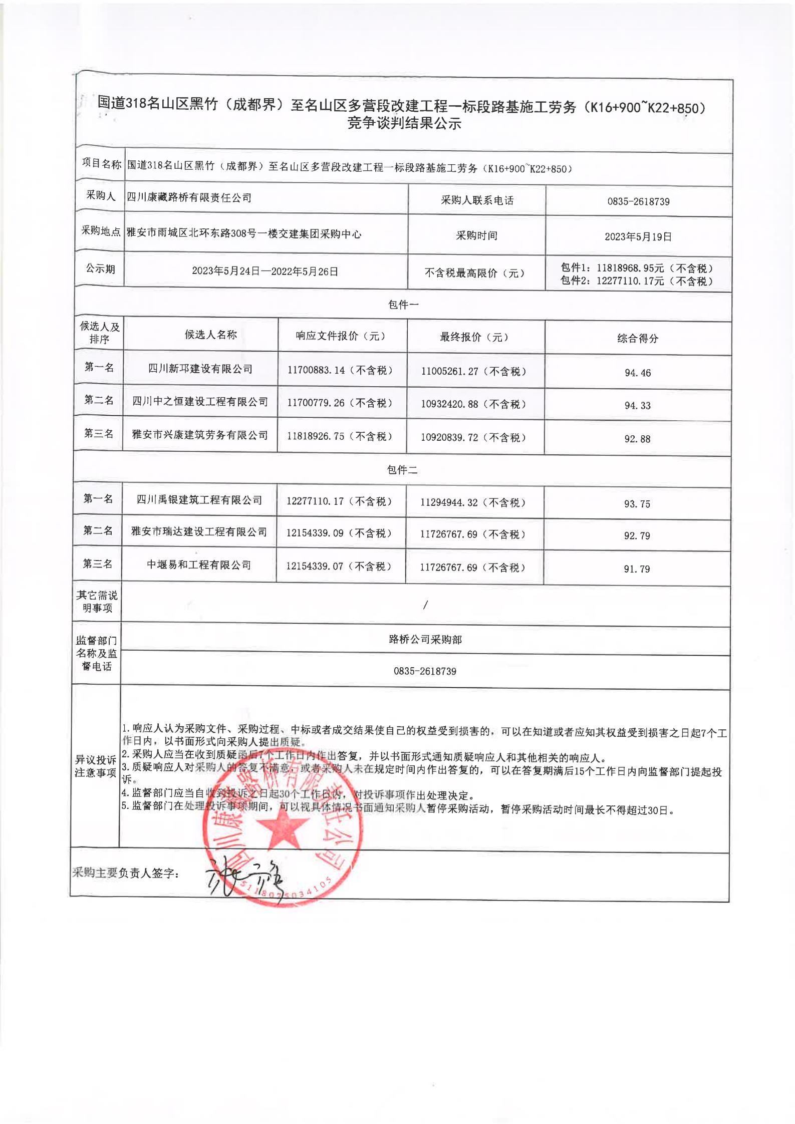 四川康藏路橋有限責任公司國道318名山區(qū)黑竹(成都界)至雨城區(qū)多營段改建工程一標段路基施工勞務(wù)(K22+850~K26+604.5)競爭談判結(jié)果公示