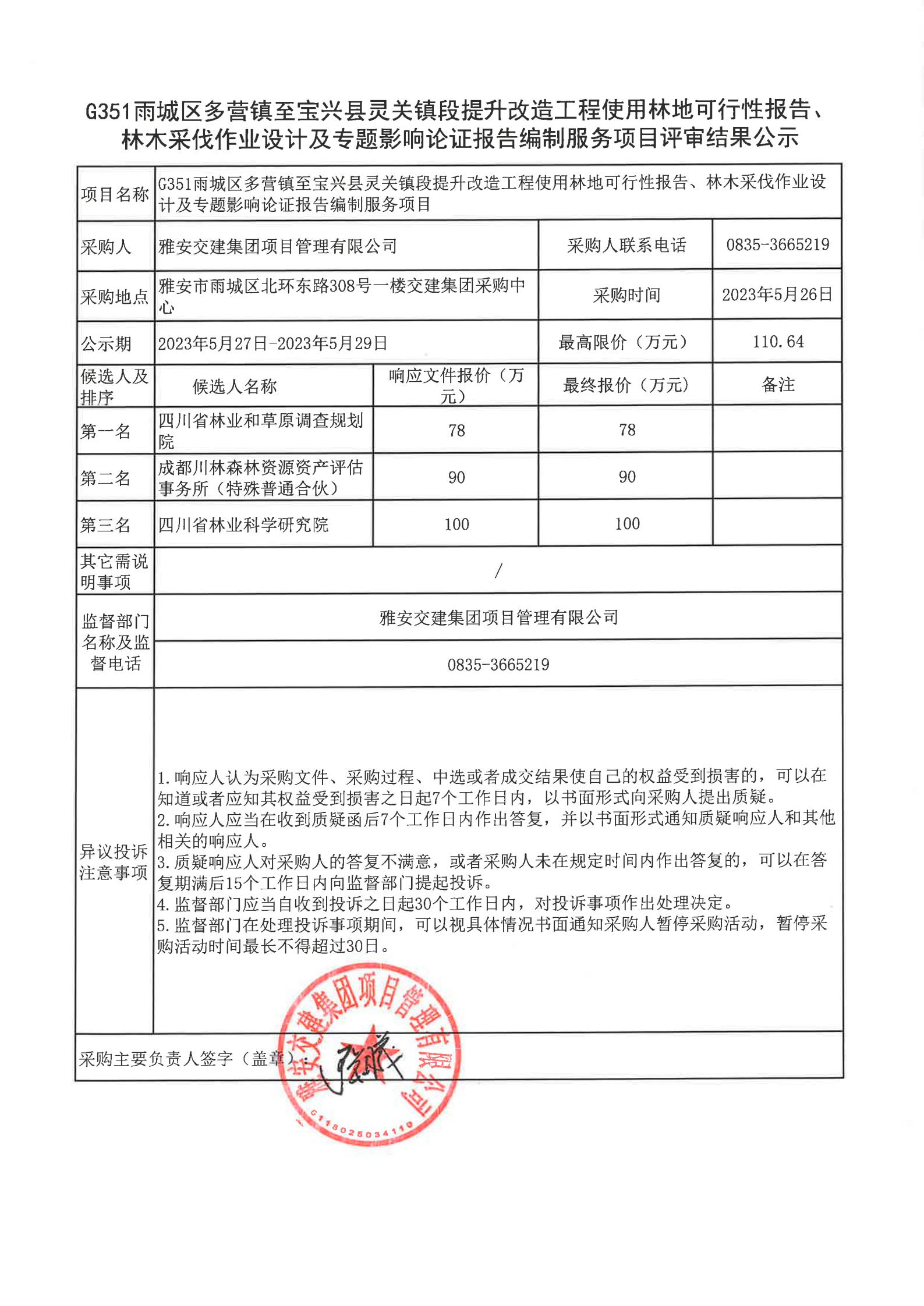 雅安交建集團項目管理有限公司G351雨城區(qū)多營鎮(zhèn)至寶興縣靈關(guān)鎮(zhèn)段提升改造工程使用林地可行性報告、林木采伐作業(yè)設(shè)計及專題影響論證報告編制服務(wù)項目評審結(jié)果公示