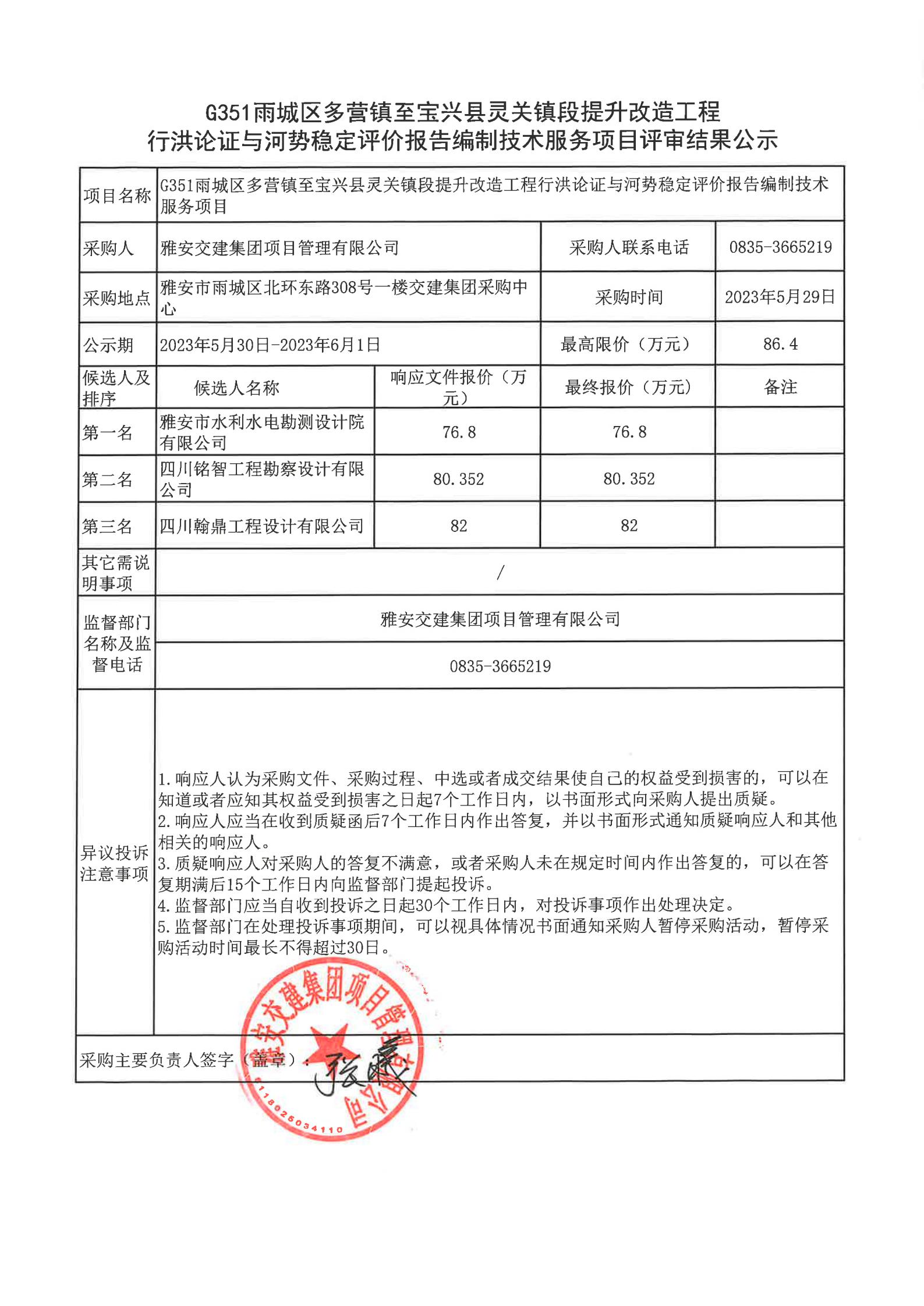 雅安交建集團項目管理有限公司G351雨城區(qū)多營鎮(zhèn)至寶興縣靈關鎮(zhèn)段提升改造工程行洪論證與河勢穩(wěn)定評價報告編制技術(shù)服務項目評審結(jié)果公示