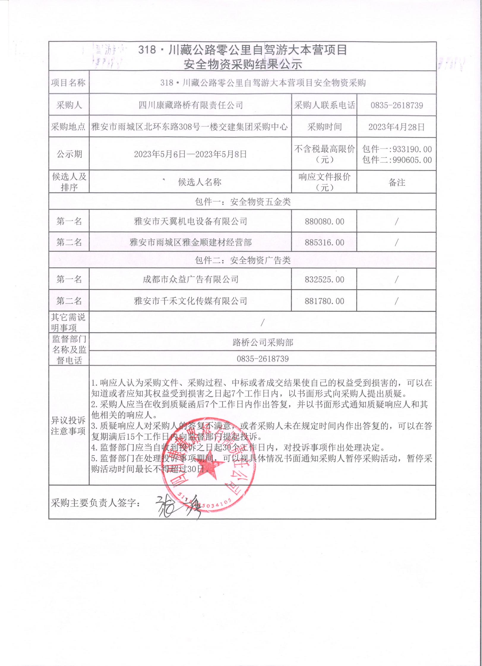 四川康藏路橋有限責(zé)任公司318·川藏公路零公里自駕游大本營(yíng)項(xiàng)目安全物資采購結(jié)果公示