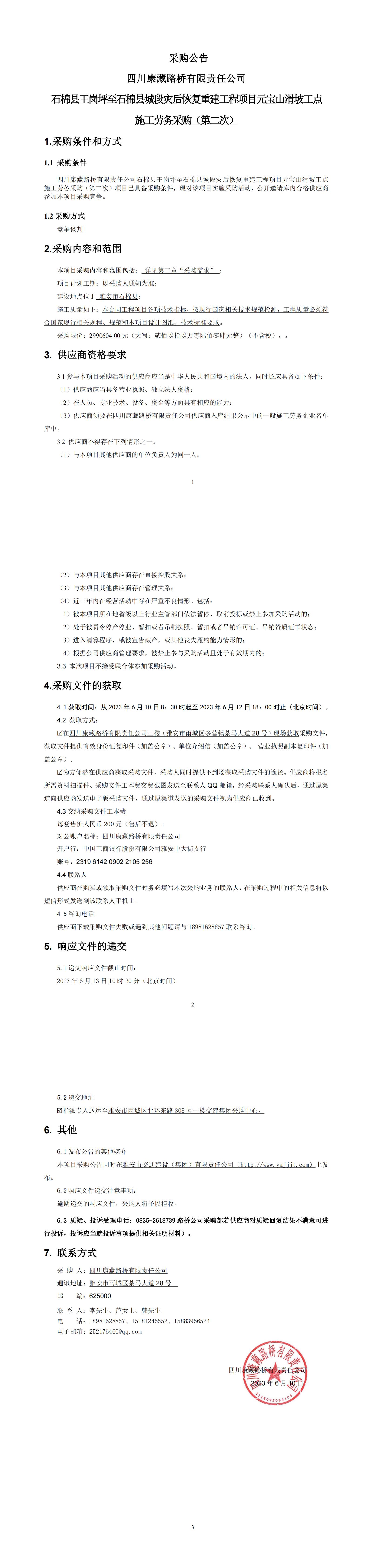 四川康藏路橋有限責任公司石棉縣王崗坪至石棉縣城段災(zāi)后恢復重建工程項目元寶山滑坡工點施工勞務(wù)采購(第二次)