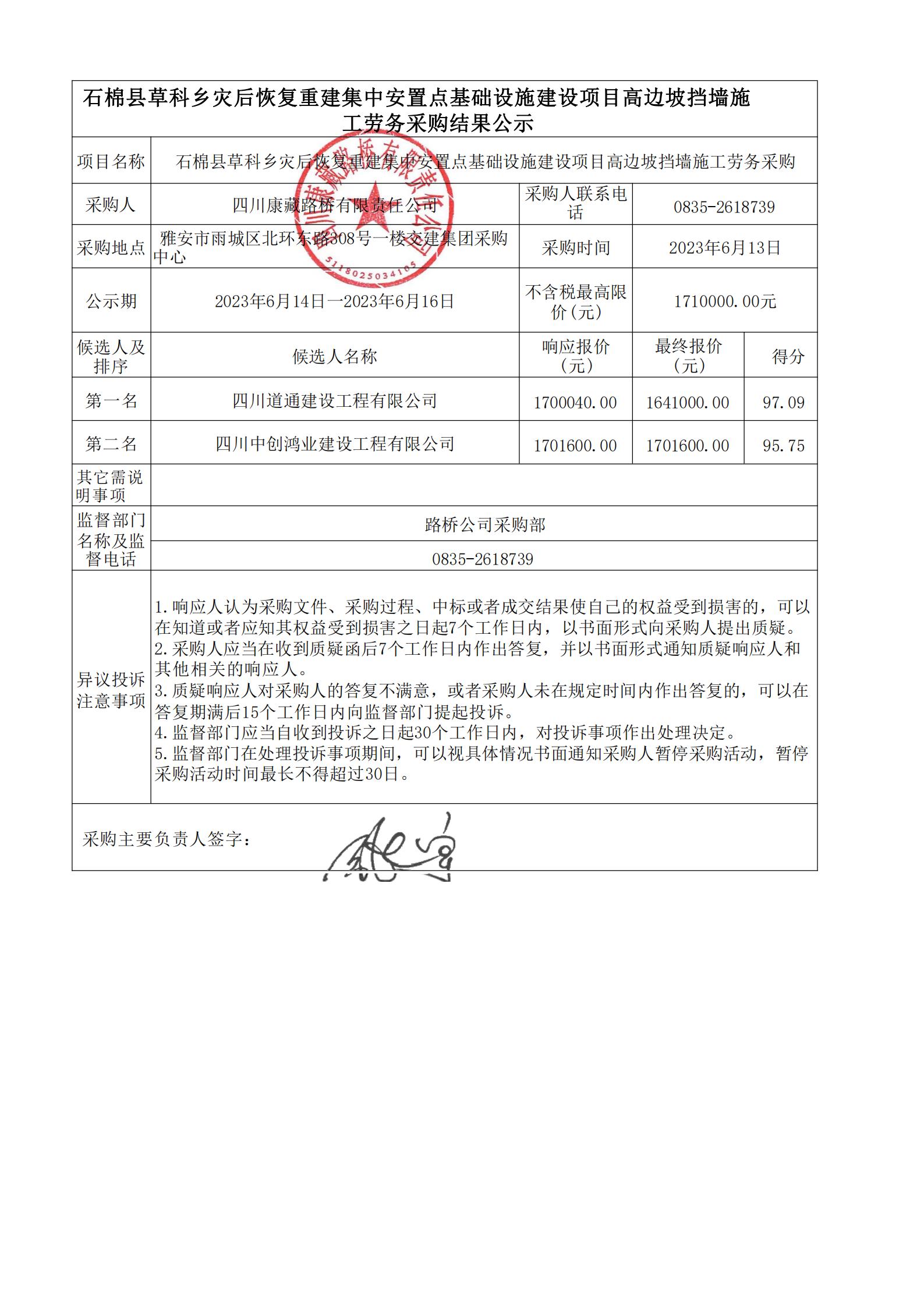 四川康藏路橋有限責(zé)任公司石棉縣草科鄉(xiāng)災(zāi)后恢復(fù)重建集中安置點(diǎn)建設(shè)項(xiàng)目農(nóng)家村村委會邊坡防護(hù)工程施工勞務(wù)采購(第三次)結(jié)果公示