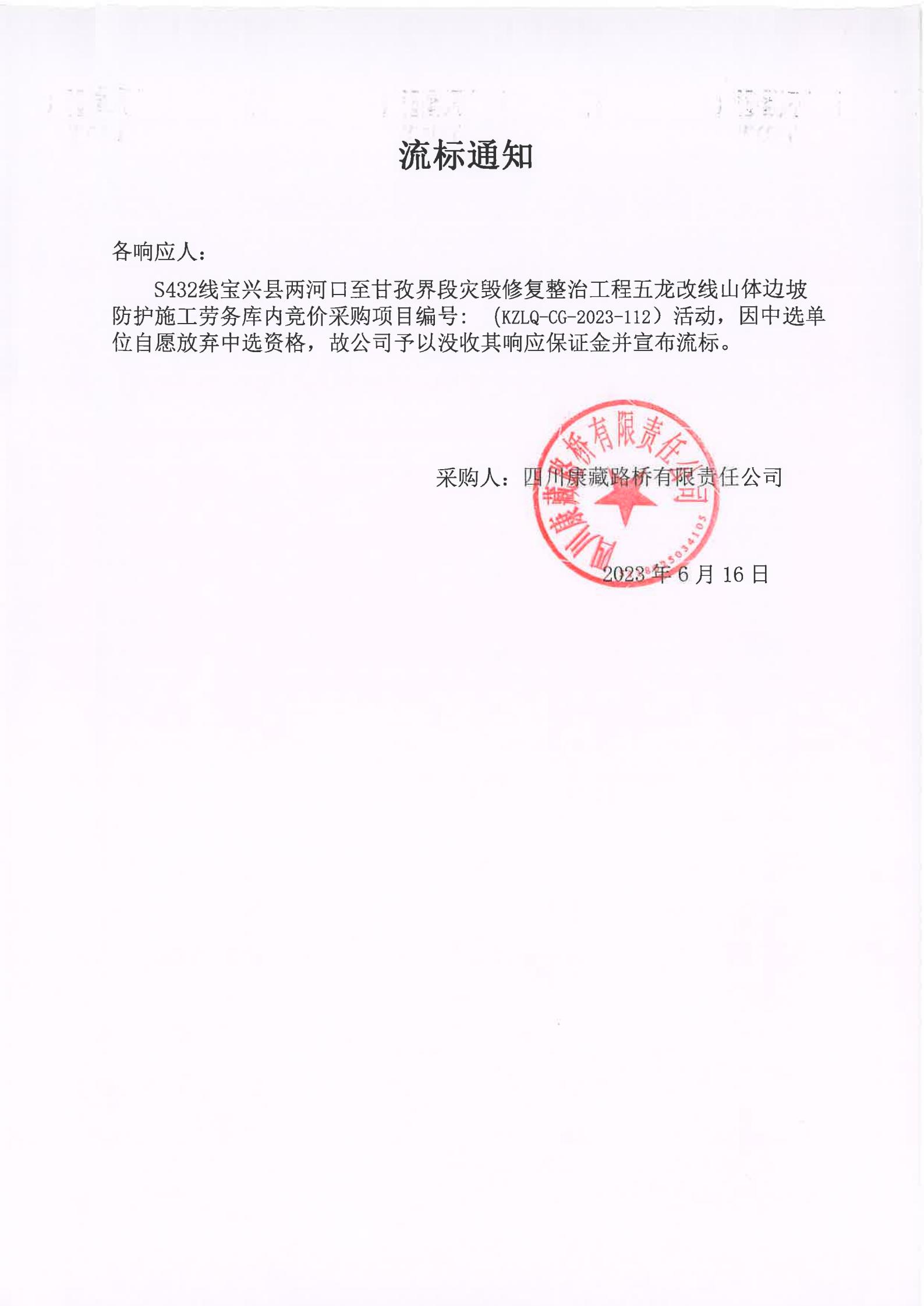四川康藏路橋有限責(zé)任公司S432線寶興縣兩河口至甘孜界段災(zāi)毀修復(fù)整治工程五龍改線山體邊坡防護施工勞務(wù)庫內(nèi)競價流標(biāo)通知
