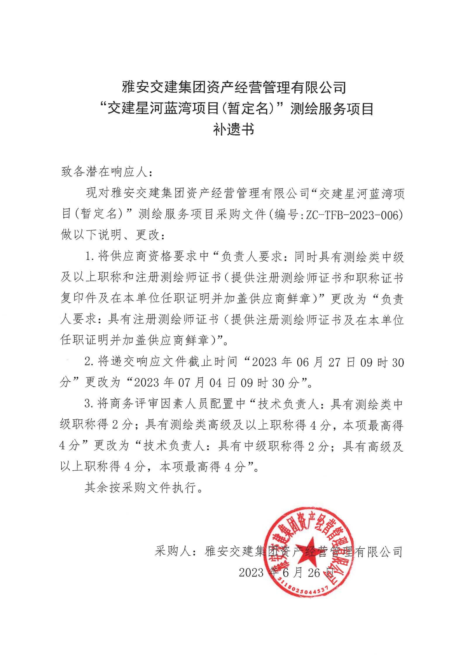 雅安交建集團(tuán)資產(chǎn)經(jīng)營管理有限公司“交建星河藍(lán)灣項(xiàng)目(暫定名)”測(cè)繪服務(wù)項(xiàng)目補(bǔ)遺書