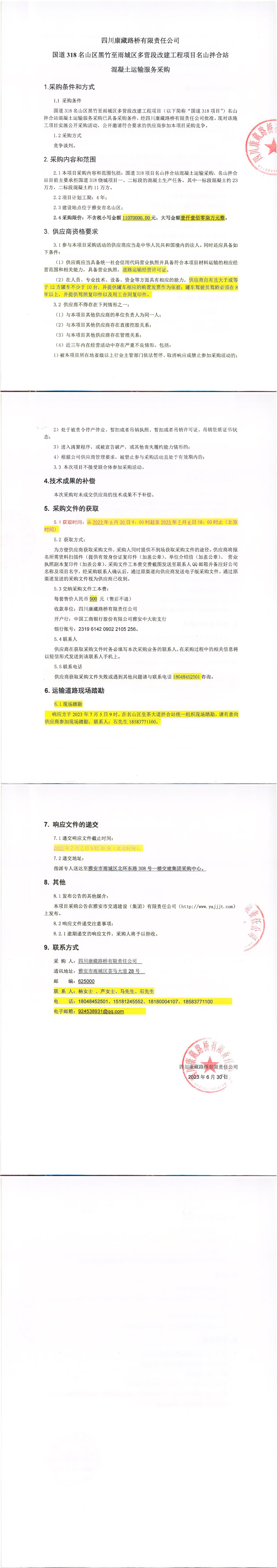 四川康藏路橋有限責任公司國道318名山區(qū)黑竹至雨城區(qū)多營段改建工程項目名山拌合站混凝土運輸服務(wù)采購