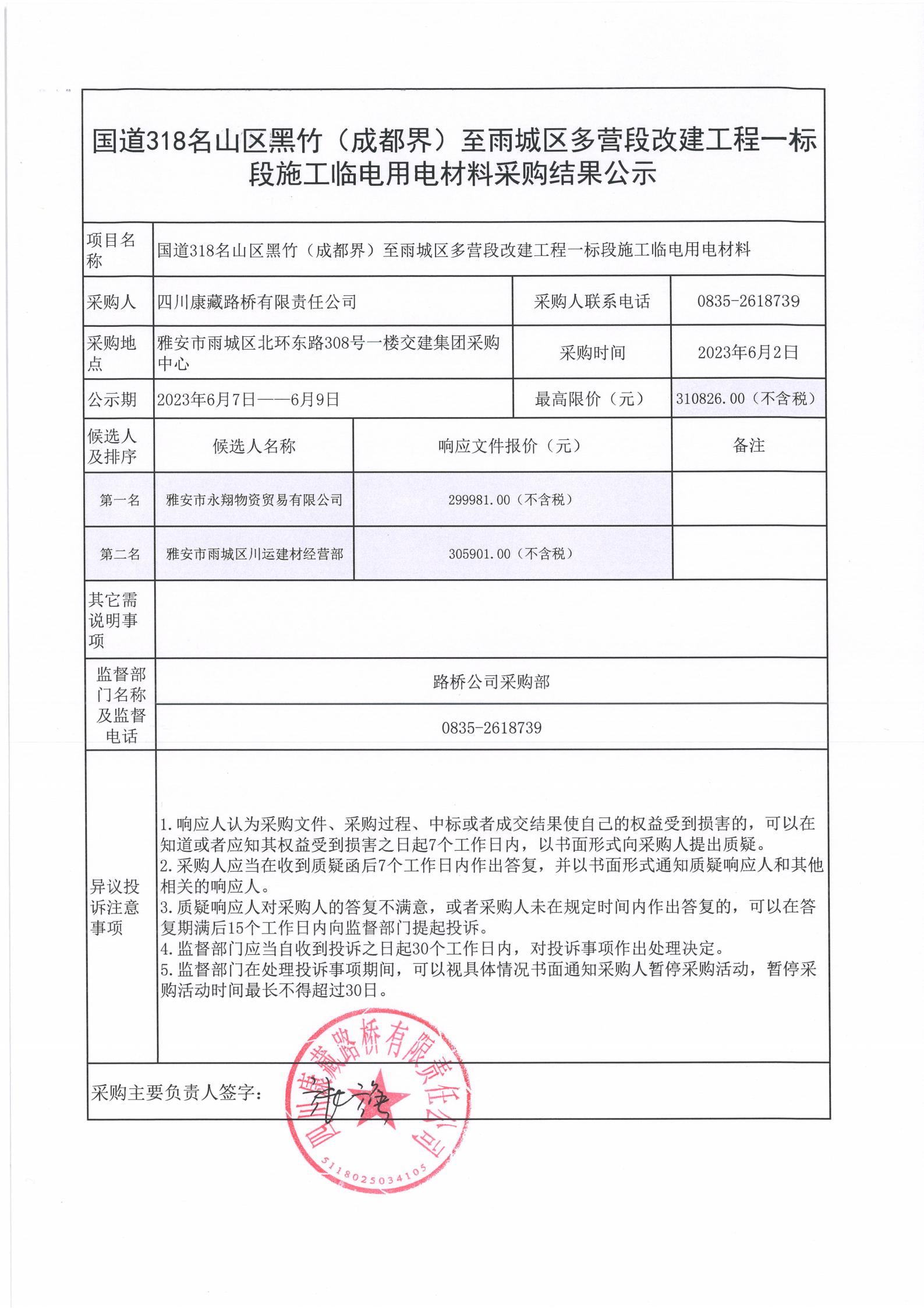 四川康藏路橋有限責任公司國道318名山區(qū)黑竹(成都界)至雨城區(qū)多營段改建工程一標段施工臨電用電材料采購結(jié)果公示