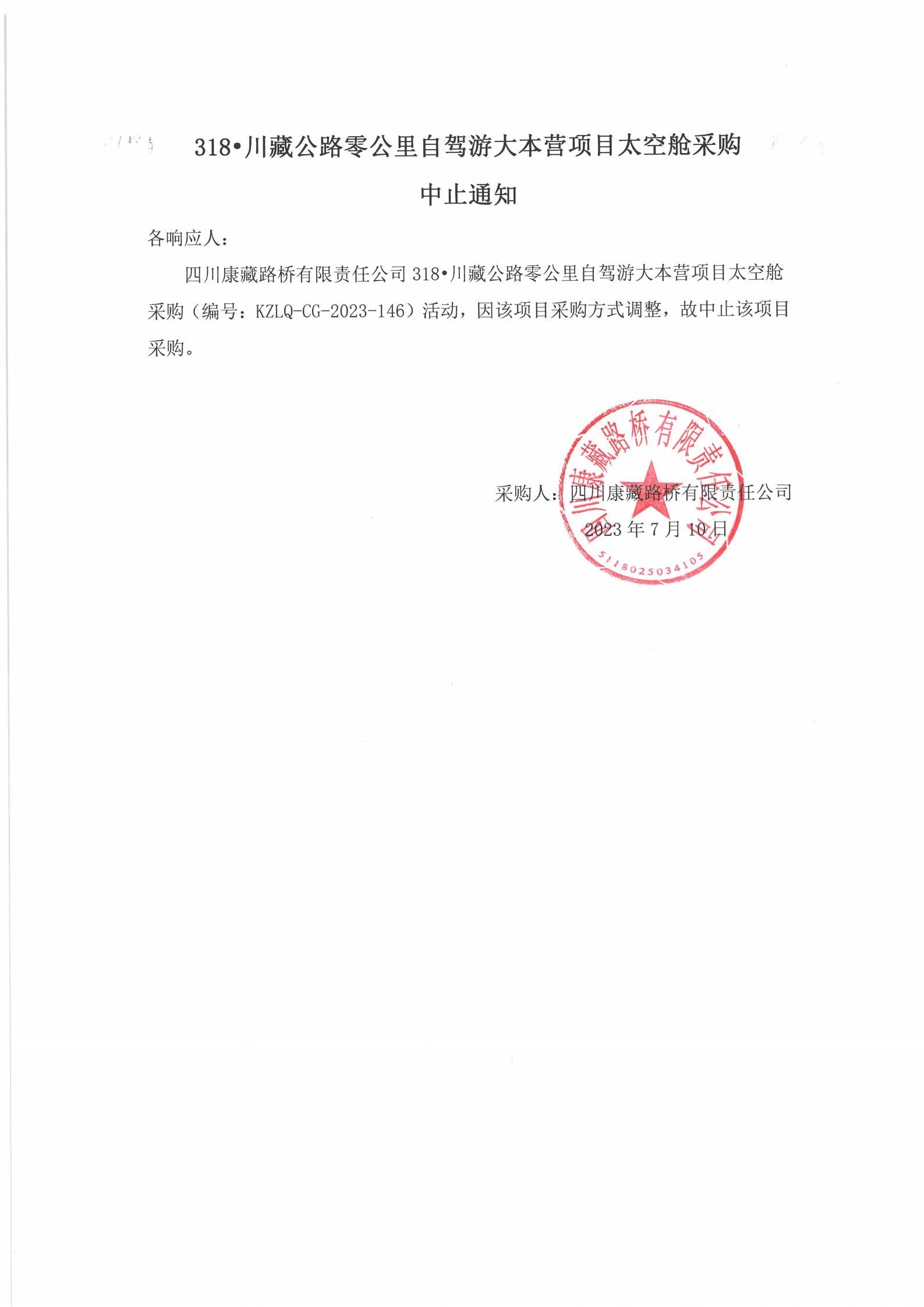 四川康藏路橋有限責(zé)任公司318·川藏公路零公里自駕游大本營項(xiàng)目太空艙采購中止通知