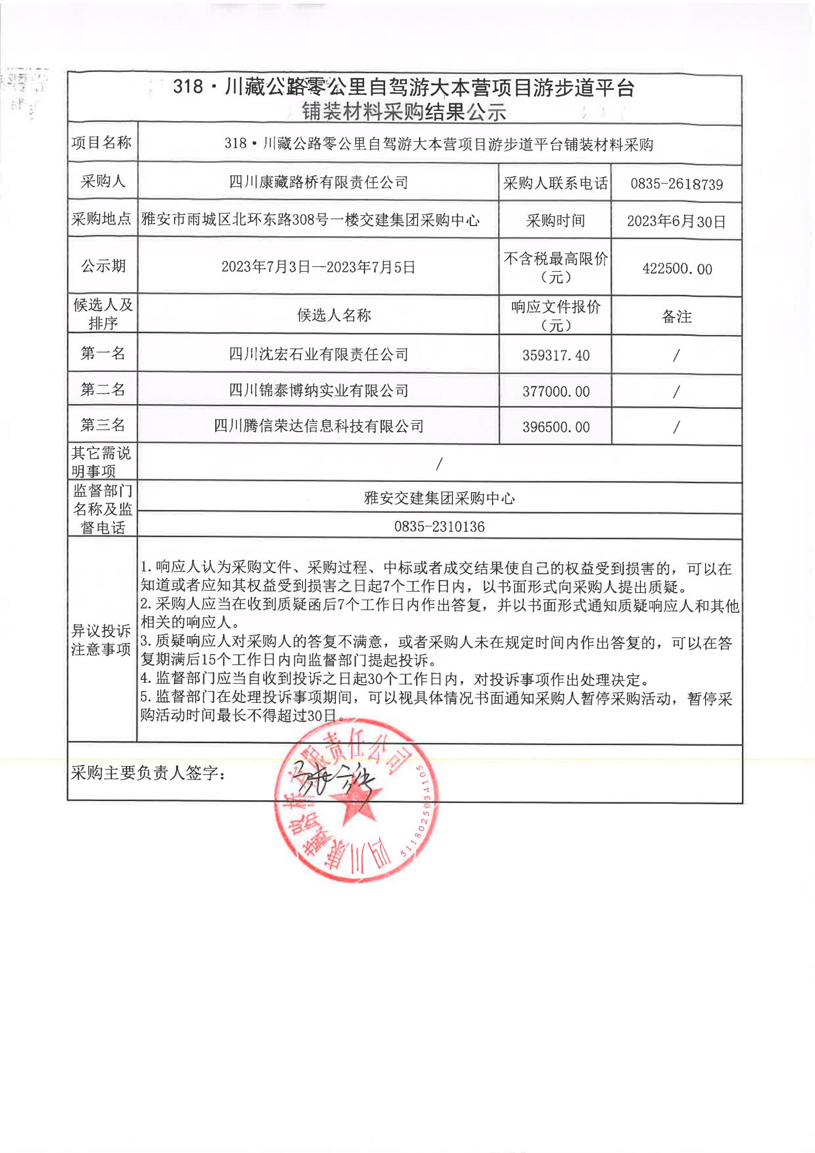 四川康藏路橋有限責(zé)任公司318·川藏公路零公里自駕游大本營(yíng)項(xiàng)目游步道平臺(tái)鋪裝材料采購結(jié)果公示