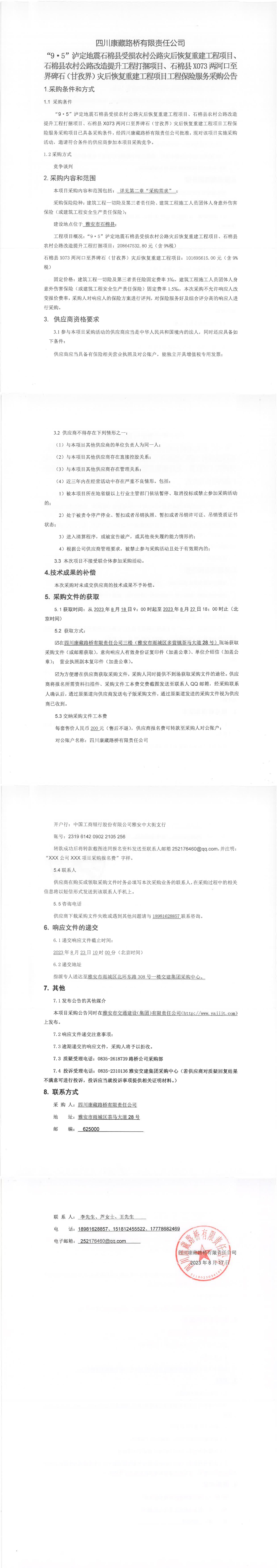 四川康藏路橋有限責任公司“9·5”瀘定地震石棉縣受損農(nóng)村公路災后恢復重建工程項目、石棉縣農(nóng)村公路改造提升工程打捆項目、石棉縣X073兩河口至界碑石(甘孜界)災后恢復重建工程項目工程保險服務采購公告