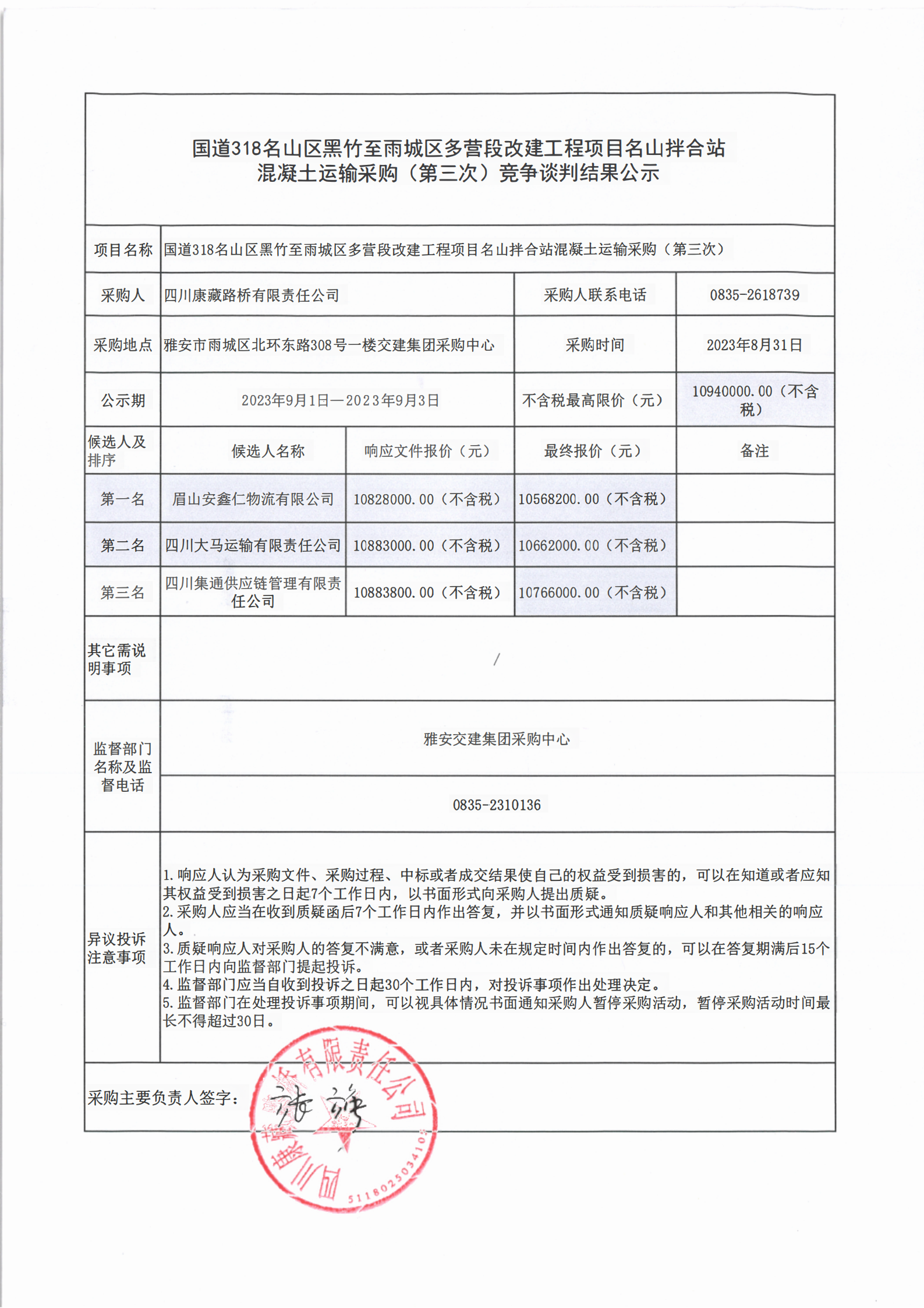四川康藏路橋有限責(zé)任公司國道318名山區(qū)黑竹至至雨城區(qū)多營段改建工程項目名山拌合站混凝土運輸采購(第三次)競爭談判結(jié)果公示
