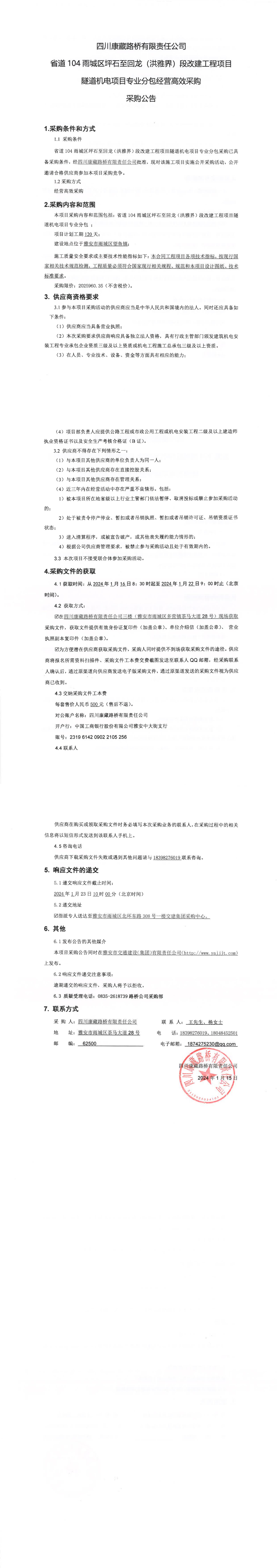 四川康藏路橋有限責(zé)任公司省道104雨城區(qū)坪石至回龍(洪雅界)段改建工程項(xiàng)目隧道機(jī)電項(xiàng)目專業(yè)分包經(jīng)營(yíng)高效采購(gòu)公告