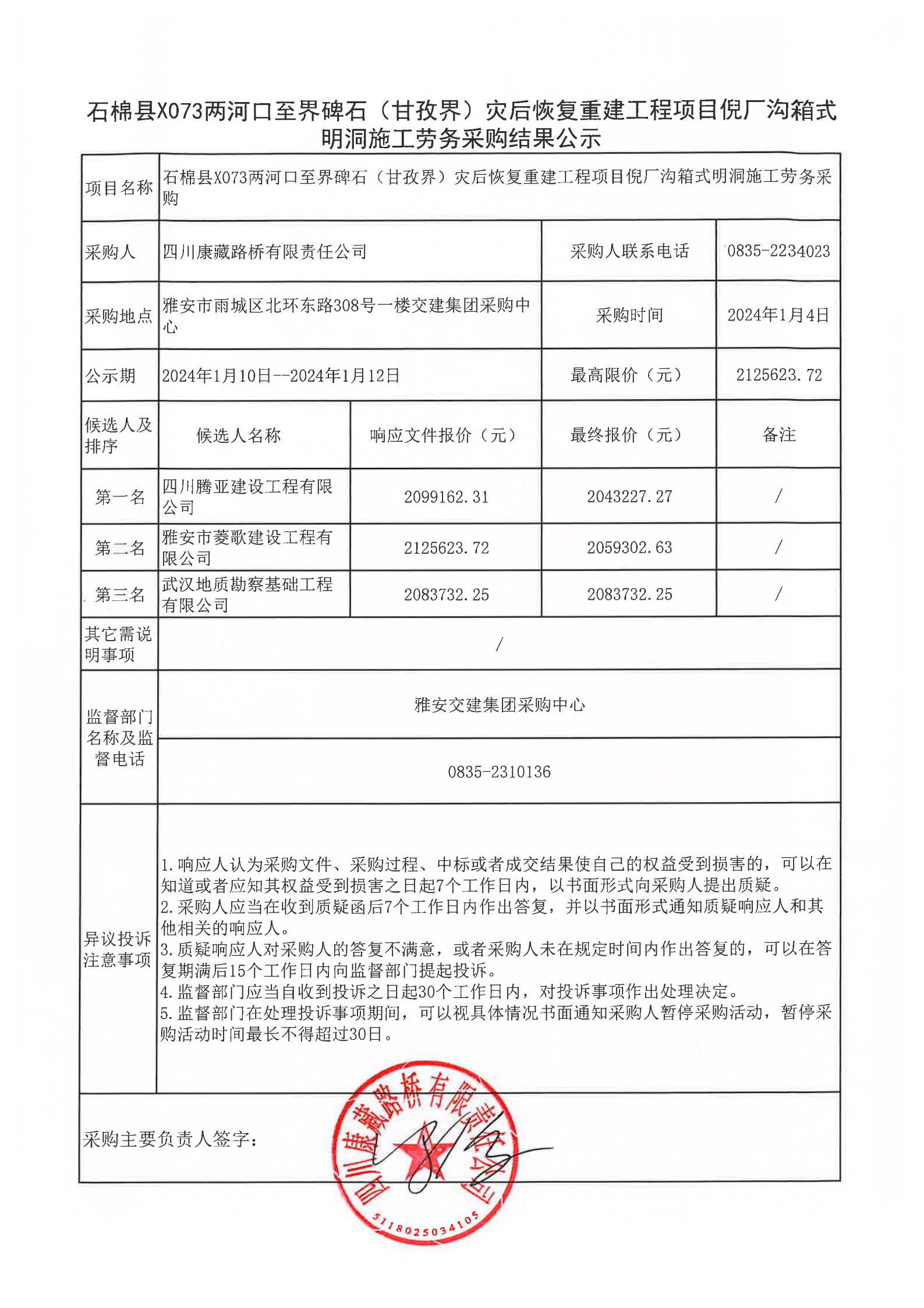 四川康藏路橋有限責(zé)任公司石棉縣X073兩河口至界碑石(甘孜界)災(zāi)后恢復(fù)重建工程項目倪廠溝箱式明洞施工勞務(wù)采購結(jié)果公示