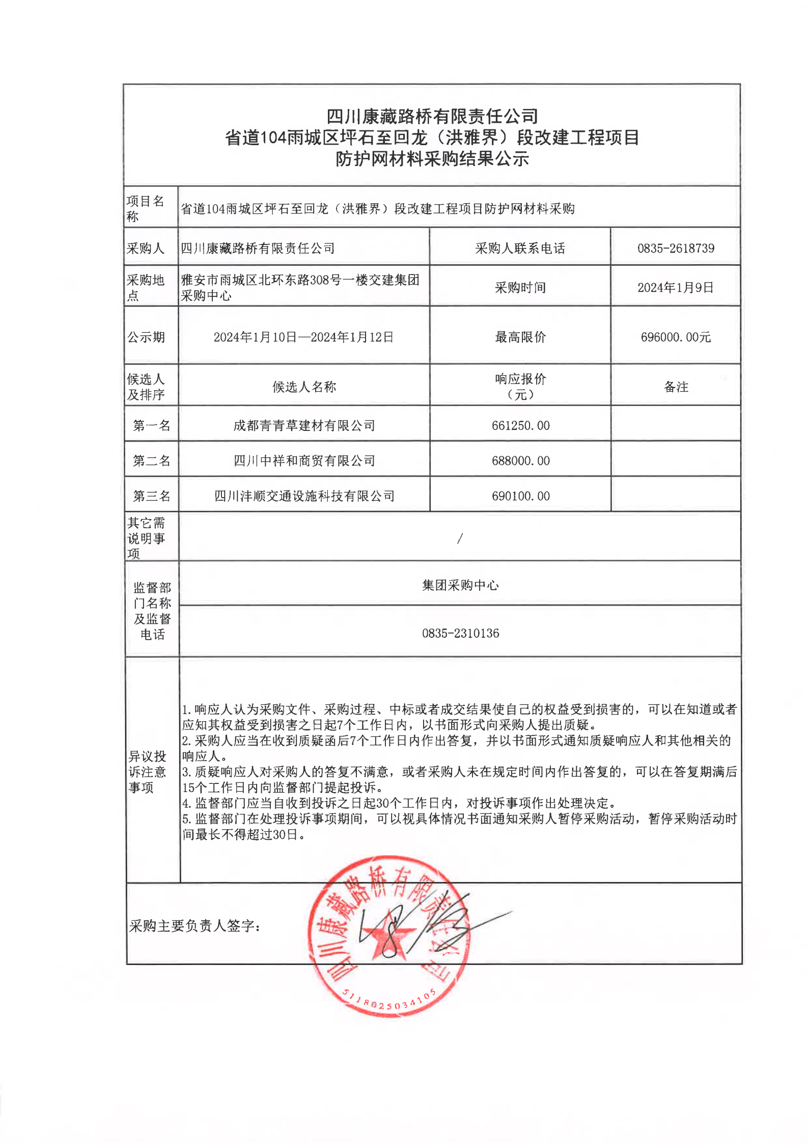 四川康藏路橋有限責任公司省道104雨城區(qū)坪石至回龍(洪雅界)段改建工程項目防護網(wǎng)材料采購結(jié)果公示