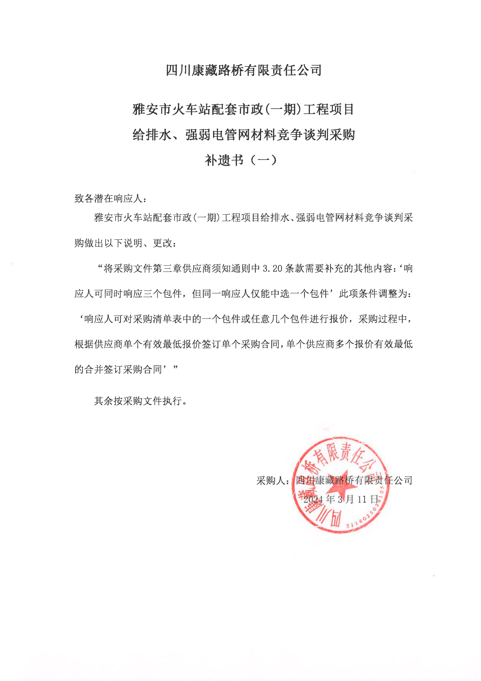 四川康藏路橋有限責任公司雅安市火車站配套市政(一期)工程項目給排水、強弱電管網(wǎng)材料競爭談判采購補遺書