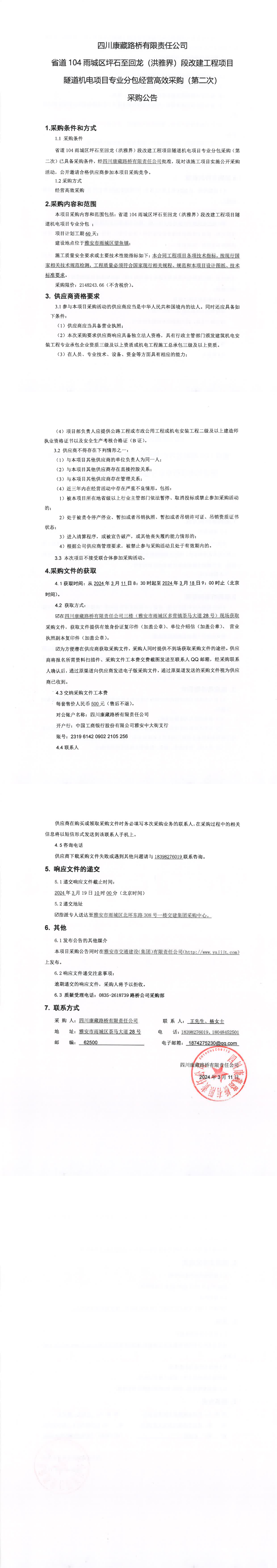 四川康藏路橋有限責任公司省道104雨城區(qū)坪石至回龍(洪雅界)段改建工程項目隧道機電項目專業(yè)分包經營高效采購(第二次)采購公告