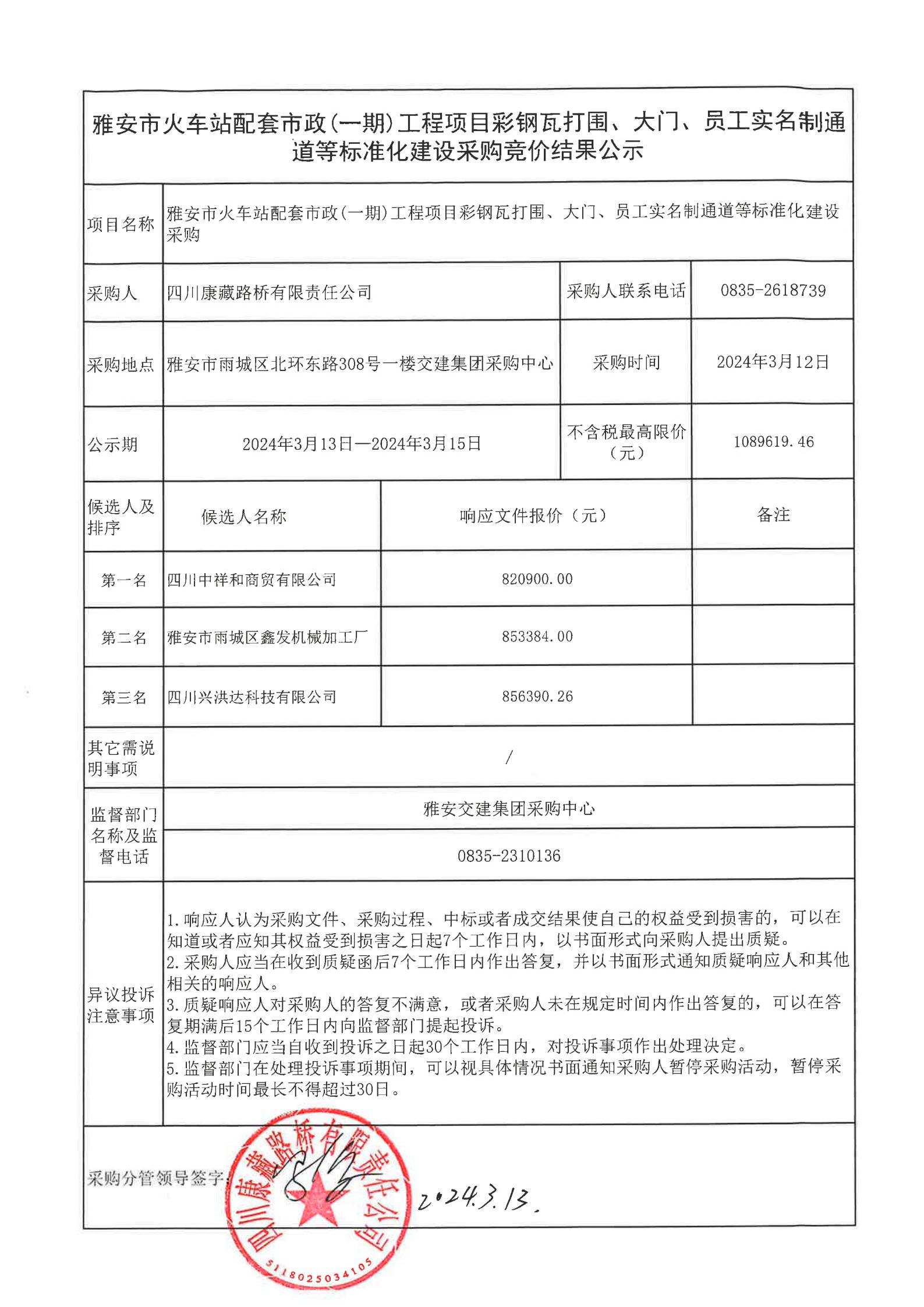 四川康藏路橋有限責(zé)任公司雅安市火車站配套市政(一期)工程項(xiàng)目彩鋼瓦打圍、大門、員工實(shí)名制通道等標(biāo)準(zhǔn)化建設(shè)采購(gòu)結(jié)果公示