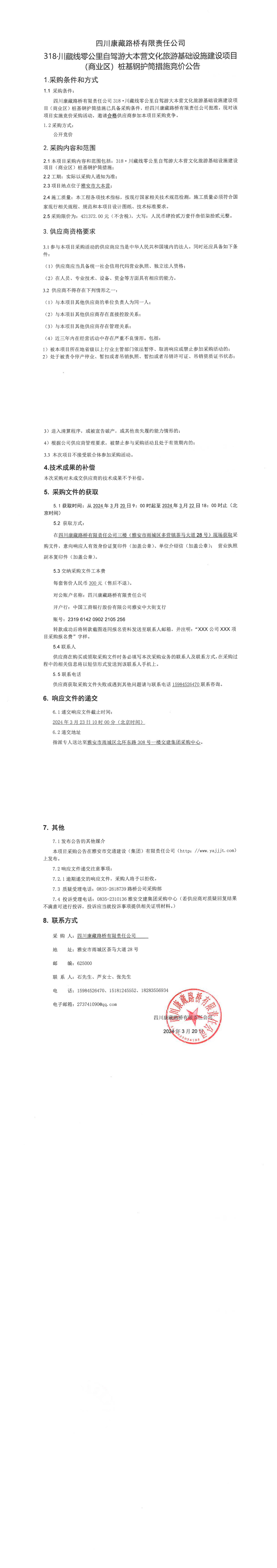 四川康藏路橋有限責任公司318·川藏公路零公里自駕游大本營文化旅游基礎設施建設項目(商業(yè)區(qū))樁基鋼護筒措施競價公告