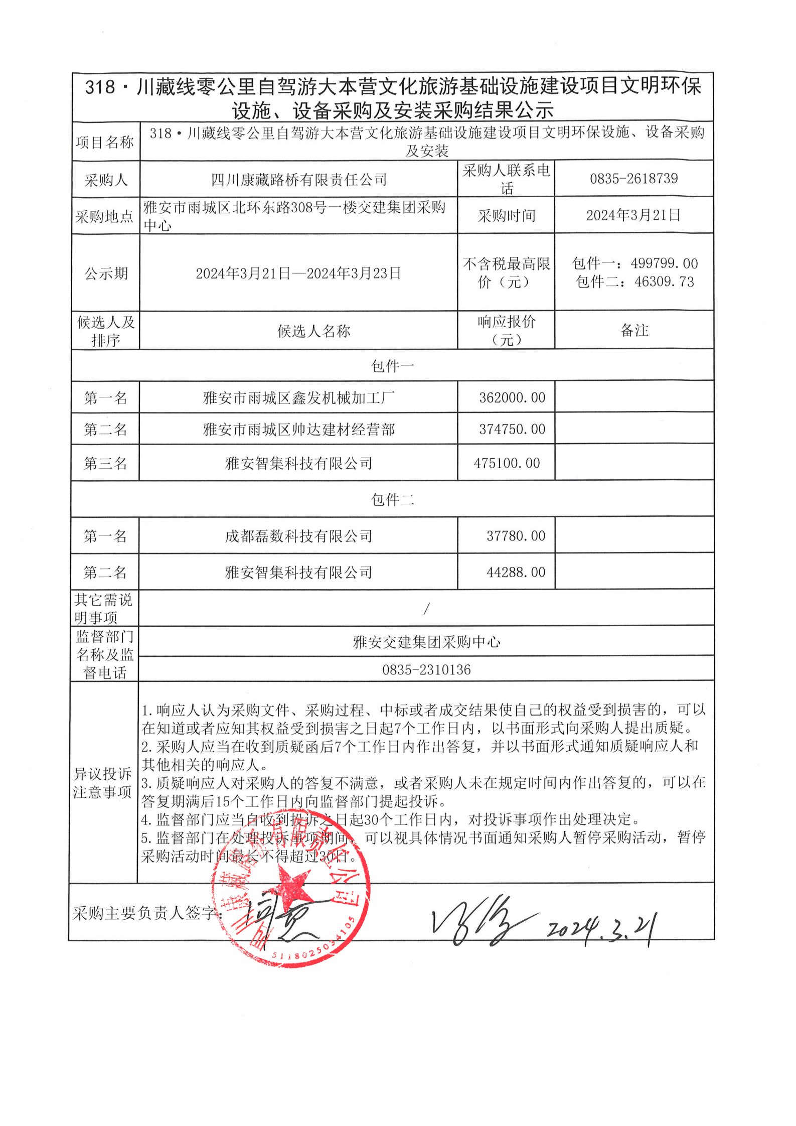 四川康藏路橋有限責任公司318·川藏線零公里自駕游大本營文化旅游基礎設施建設項目文明環(huán)保設施、設備采購及安裝采購結果公示