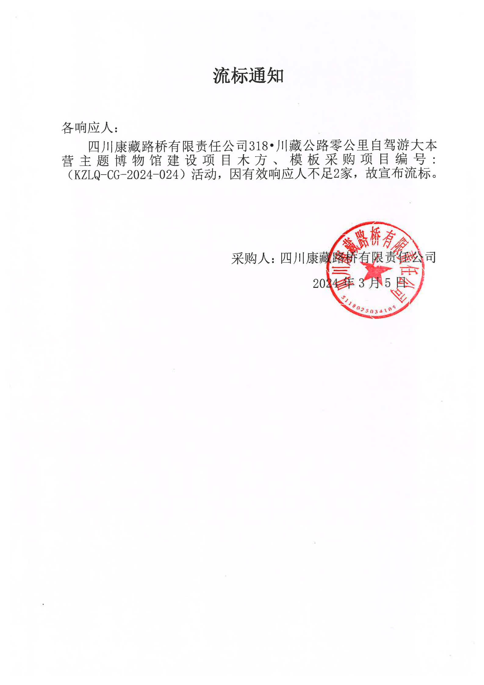四川康藏路橋有限責(zé)任公司318·川藏公路零公里自駕游大本營主題博物館建設(shè)項(xiàng)目木方、模板采購流標(biāo)通知