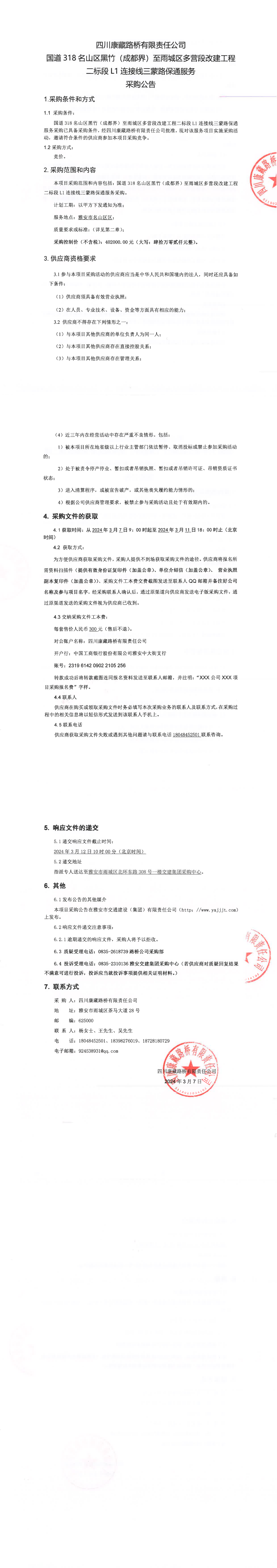 四川康藏路橋有限責任公司國道318名山區(qū)黑竹(成都界)至雨城區(qū)多營段改建工程二標段L1連接線三蒙路保通服務采購公告