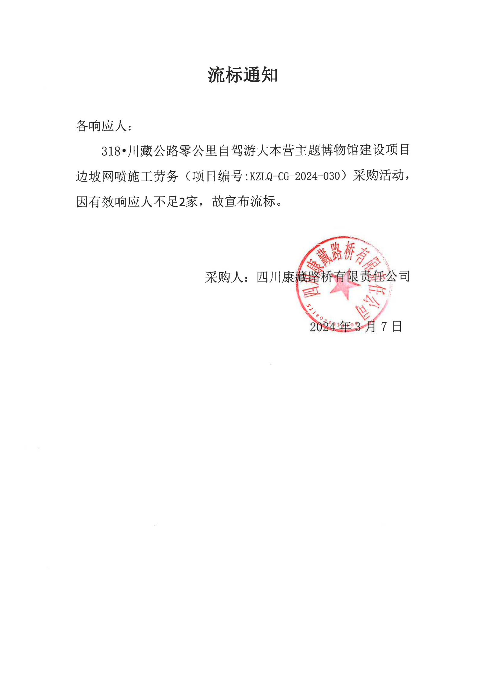 四川康藏路橋有限責(zé)任公司318·川藏公路零公里自駕游大本營主題博物館建設(shè)項目邊坡網(wǎng)噴施工勞務(wù)流標(biāo)通知