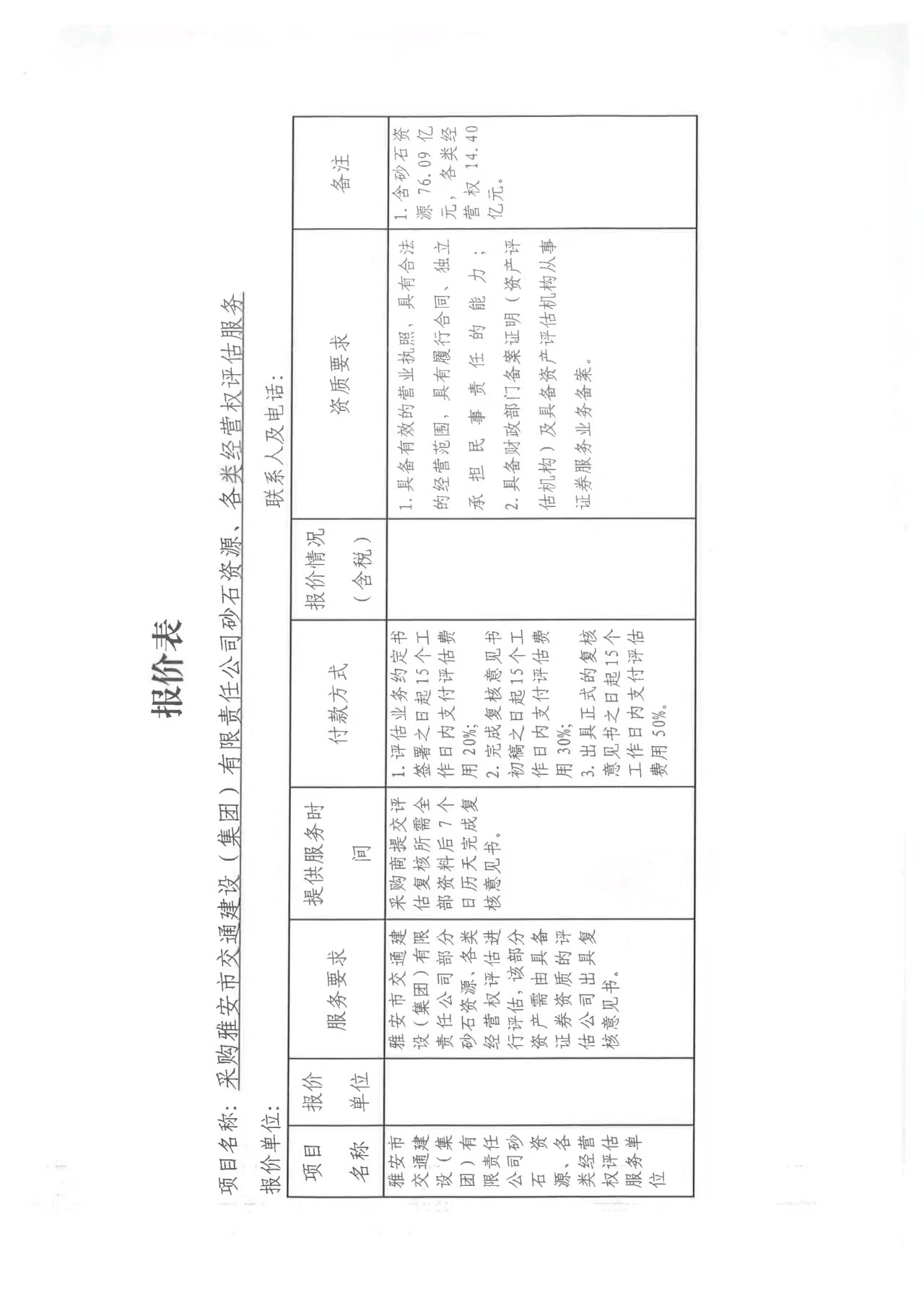 關于雅安市交通建設(集團)有限責任公司砂石資源、各類經(jīng)營權評估服務限價的詢價函