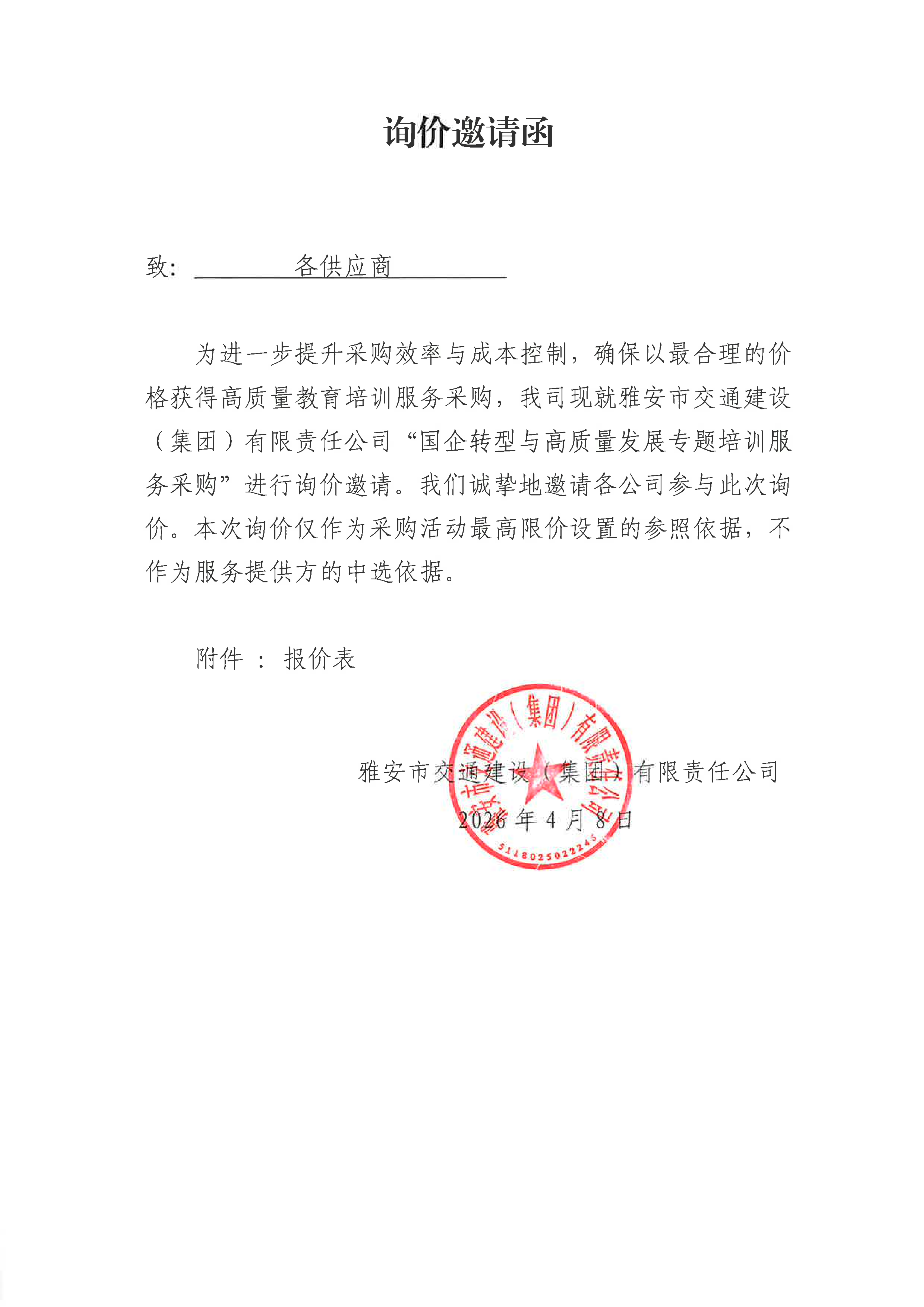 關(guān)于雅安市交通建設(shè)(集團(tuán))有限責(zé)任公司國(guó)企轉(zhuǎn)型與高質(zhì)量發(fā)展專題培訓(xùn)服務(wù)采購(gòu)限價(jià)的詢價(jià)函