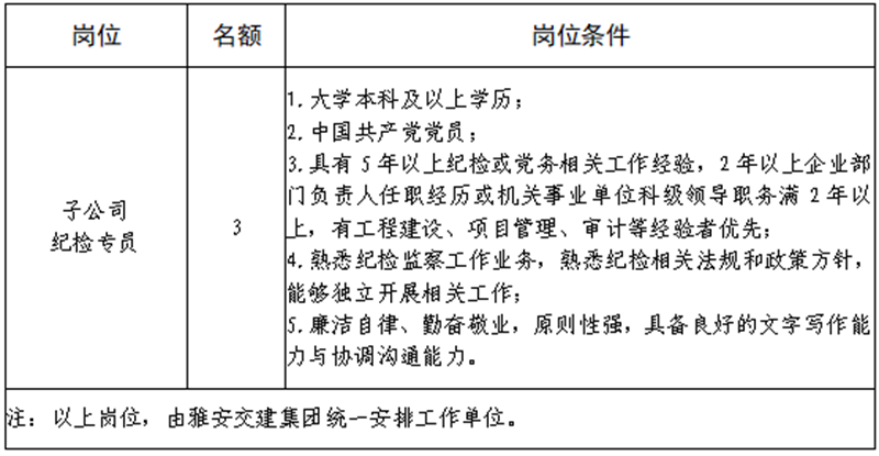 根據(jù)發(fā)展需要,決定面向社會(huì)公開招聘雅安市交通建設(shè)(集團(tuán))有限責(zé)任公司(以下簡稱“雅安交建集團(tuán)”)所屬子公司紀(jì)檢專員3名,現(xiàn)將有關(guān)事項(xiàng)公告如下: