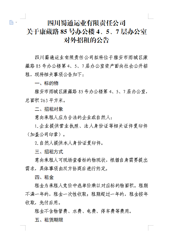 四川蜀通運業(yè)有限責任公司關于康藏路85號辦公樓4、5、7樓資產租賃公告附件