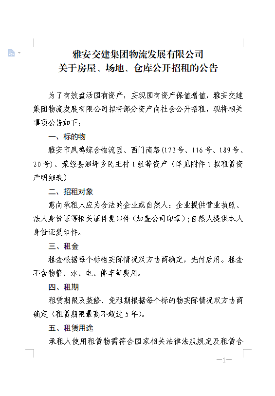 雅安交建集團(tuán)物流發(fā)展有限公司關(guān)于房屋、場(chǎng)地、倉(cāng)庫(kù)公開(kāi)招租的公告附件1、2