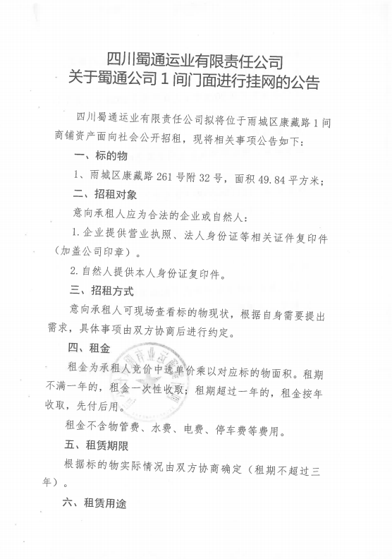 四川蜀通運(yùn)業(yè)有限責(zé)任公司關(guān)于蜀通公司1間門面進(jìn)行掛網(wǎng)的公告