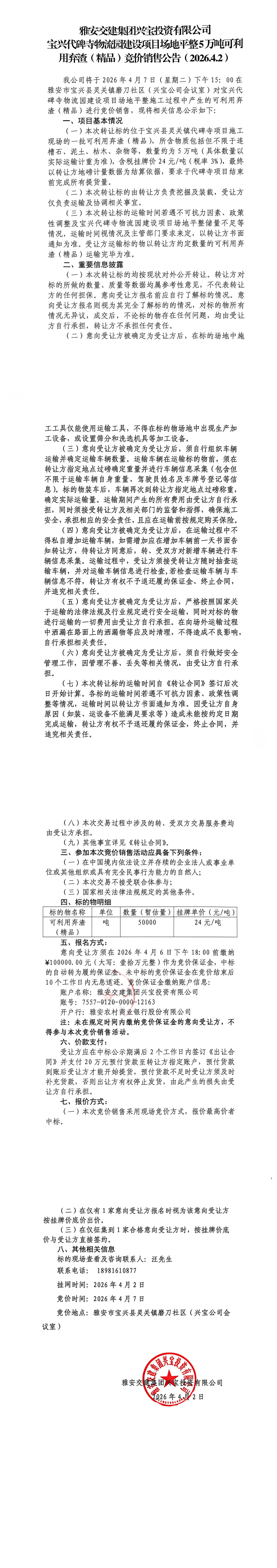 雅安交建集團(tuán)興寶投資有限公司 寶興代碑寺物流園建設(shè)項(xiàng)目場地平整5萬噸可利用棄渣(精品)競價銷售公告